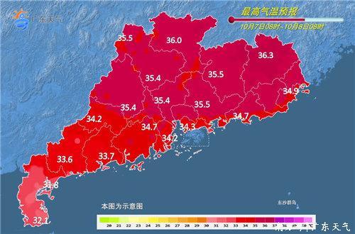6日白天最高气温分布:粤北大部、珠三角北部、粤东的北部市县、惠州33~35℃,其中梅州蕉岭录得全省最高气温35.9℃,雷州半岛29~30℃,其余市县普遍介于31~32℃。7日早晨最低气温分布:粤西、珠三角中南部、粤东、梅州24~26℃,其余市县21~23℃,其中河源连平录得全省最低气温21.2℃。