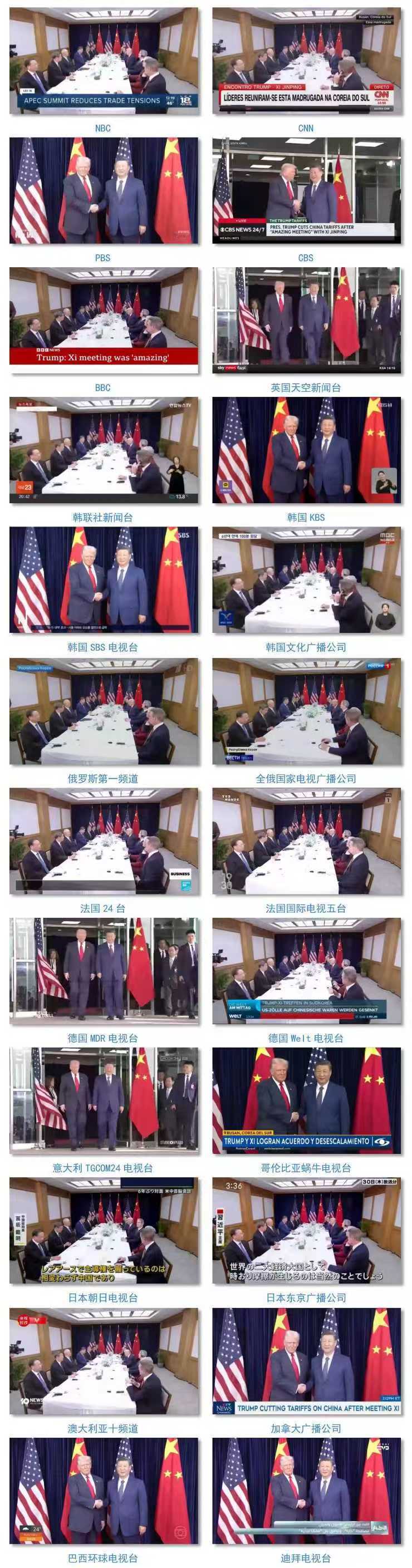 总台报道时效全面领先美西方主流媒体,成为全球媒体争相转引的独家信源。总台直播信号和新闻视频被美联社、CNN、彭博电视、NBC、CNBC等美国媒体第一时间采用,韩国KBS、SBS、韩联社新闻台、YTN电视台、韩国文化广播公司等5家韩国主流媒体全程转播,BBC、路透社、法新社、法国24台、德国之声、全俄国家电视广播公司、葡萄牙国家广播电视台、日本朝日电视台、新加坡亚洲新闻台、印度ZEE传媒集团等几乎所有海外主流媒体广泛转载。美国《国际日报》、英国富中传媒、《欧洲侨报》《北欧时报》《葡新报》、希中网、西非在线、日本华商网、南亚在线等全球主流华文媒体,以及香港明珠传媒、澳门明言传媒等港澳媒体也纷纷转发。