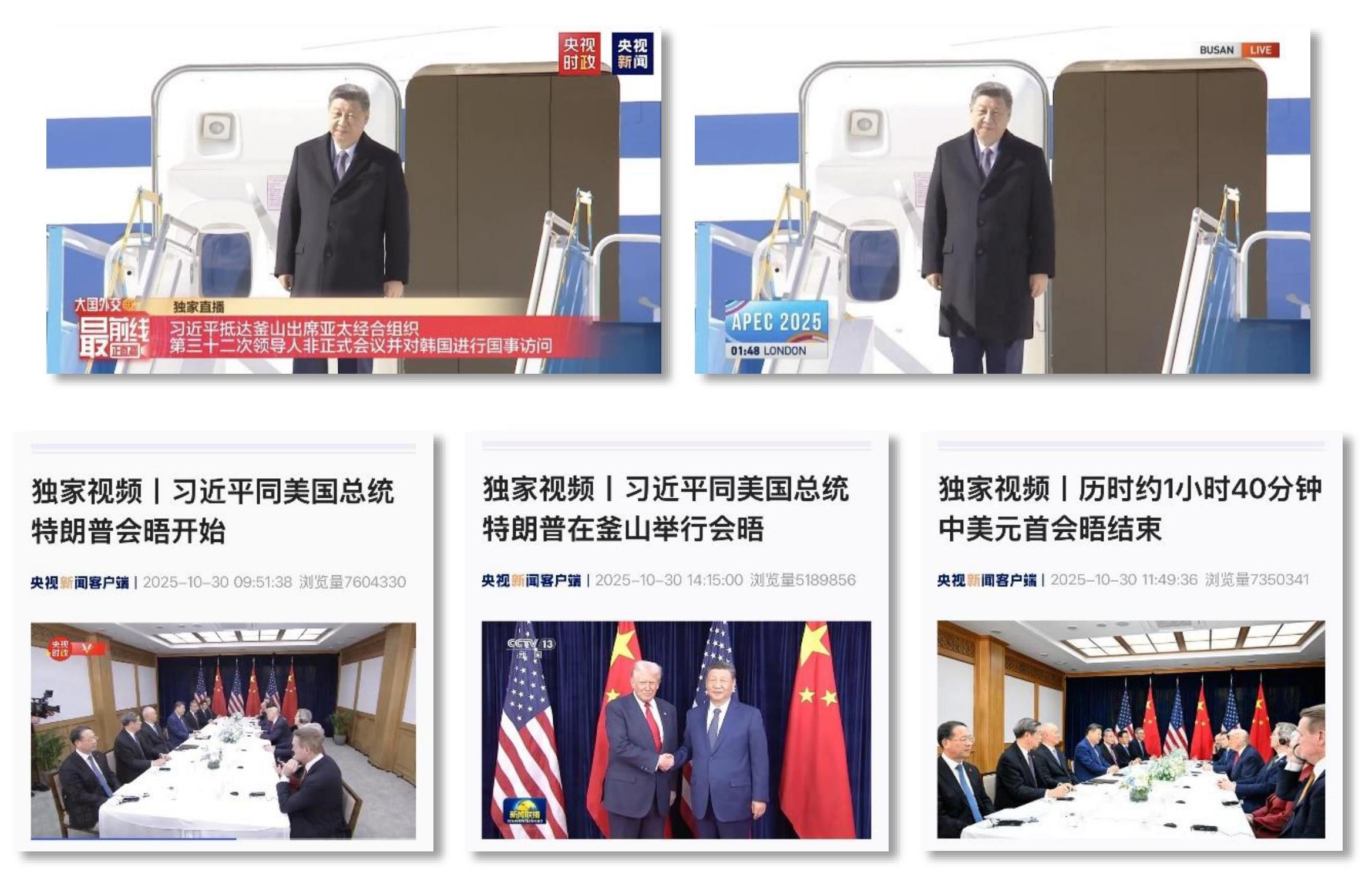 全部重要消息实现全球首发!紧随会晤进程,央视新闻新媒体、CGTN推出直播特别节目,实时发布《习近平抵达韩国釜山》《习近平同美国总统特朗普在釜山会晤》《历时约1小时40分钟 中美元首会晤结束》等18条独家视频、时政快讯,总台国际视频通讯社同步对外推送,以“零时差”速度将会晤关键瞬间、共识成果传遍世界。CGTN直播特别节目在谷歌搜索排名第一。