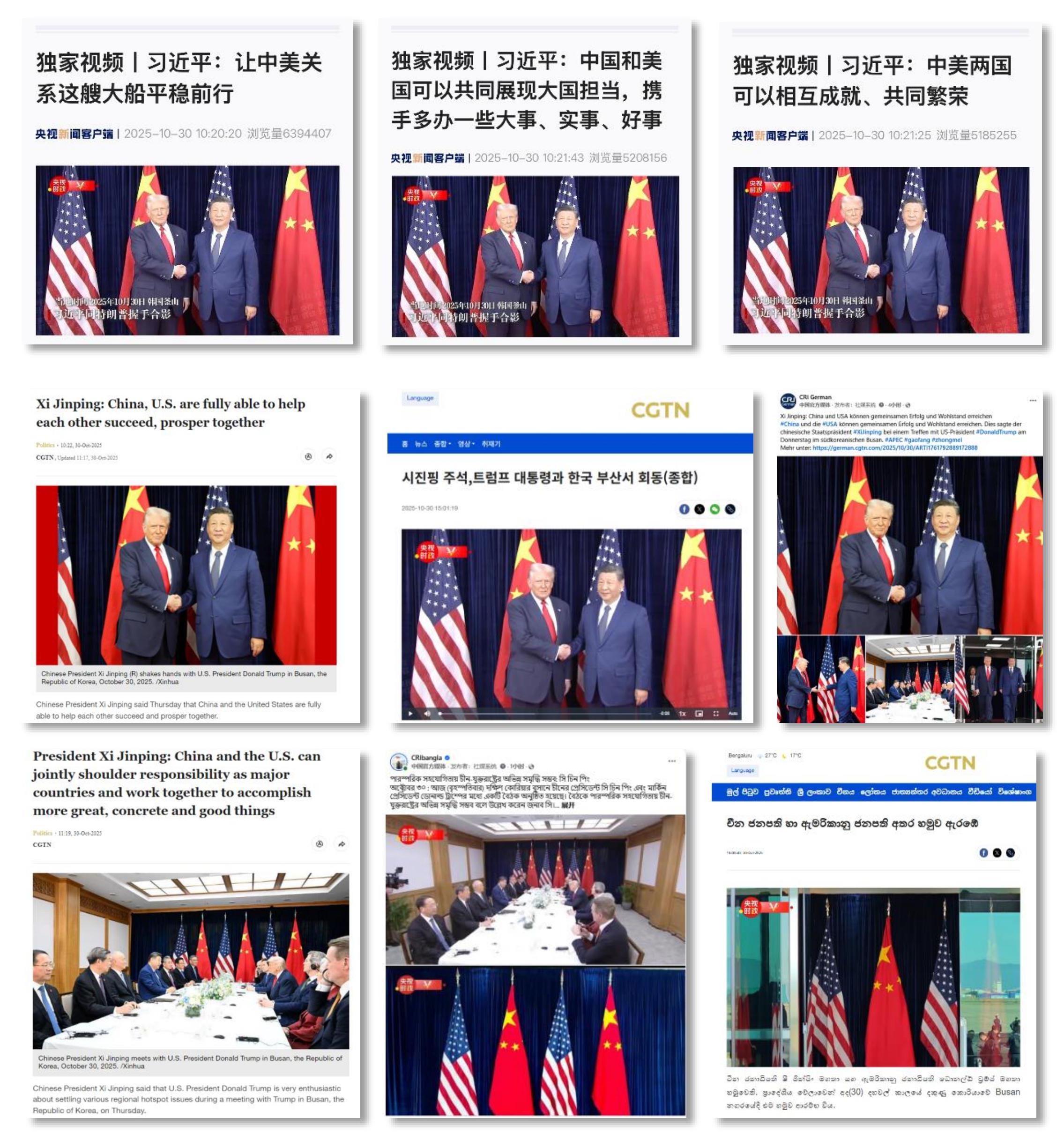 “大国外交最前线”“国际锐评”“时政新闻眼”“时政微观察”“主播说联播”“先声夺人”“天下观”等品牌专栏立体联动,推出《中美元首会晤开场白,传递哪些重磅信息?》《中美元首釜山会晤,这些重点值得关注》《元首外交掌舵定向》《中美元首会晤 迈向共赢未来》等系列评论,多角度解读习近平主席重要讲话和两国元首会晤为动荡不安的世界注入宝贵的稳定性与确定性。