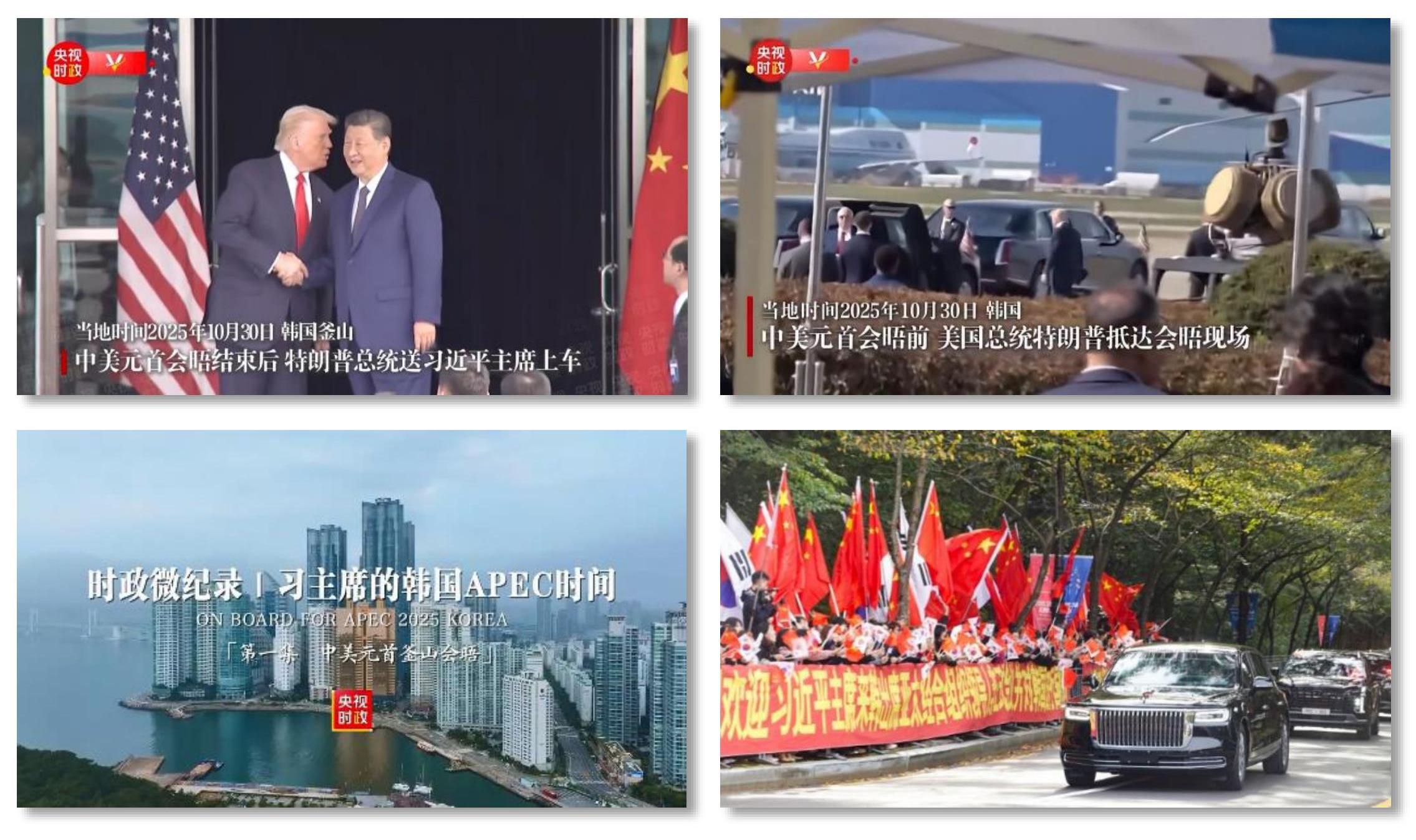 新媒体产品引发现象级传播!时政微纪录“习主席的韩国APEC时间”推出第一集《中美元首釜山会晤》,展现习主席把握大势、驾驭大局,为改善发展中美关系确定基调、指明方向。视频产品《中美元首会晤前 美国总统特朗普抵达会晤现场》《中美元首会晤结束后 特朗普总统送习近平主席上车》,精准捕捉细节画面,以生动的镜头语言传递美方对双方元首会晤的高度重视,彰显习近平主席的崇高国际威望。系列产品获全网置顶推荐,央视新闻发起的#中美元首釜山会晤#等9个微博话题总阅读量超5亿。