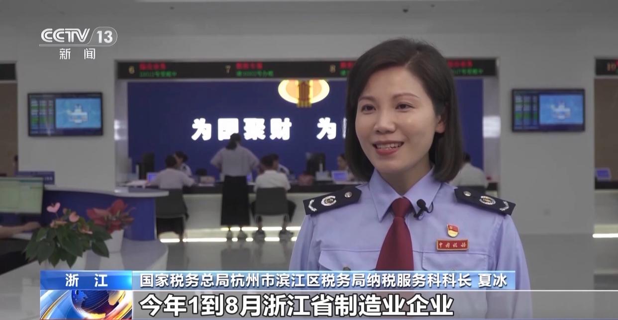 国家税务总局杭州市滨江区税务局纳税服务科科长 夏冰:今年1至8月,浙江省制造业企业销售收入同比增长4.4%,其中高技术制造业、高端装备制造业同比分别增长15.3%和10.5%,有力拉动整体增幅,全省制造业高端化、智能化、绿色化水平持续提升。