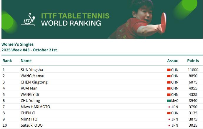 10月21日,国际乒联公布2025年第43周排名:女单方面,孙颖莎11600分连续第171周霸榜第一,王曼昱8850分排名第二,陈幸同6075分排名第三。
