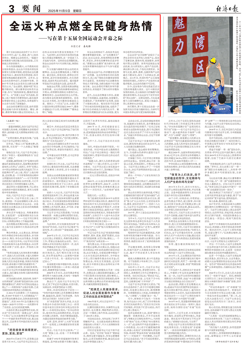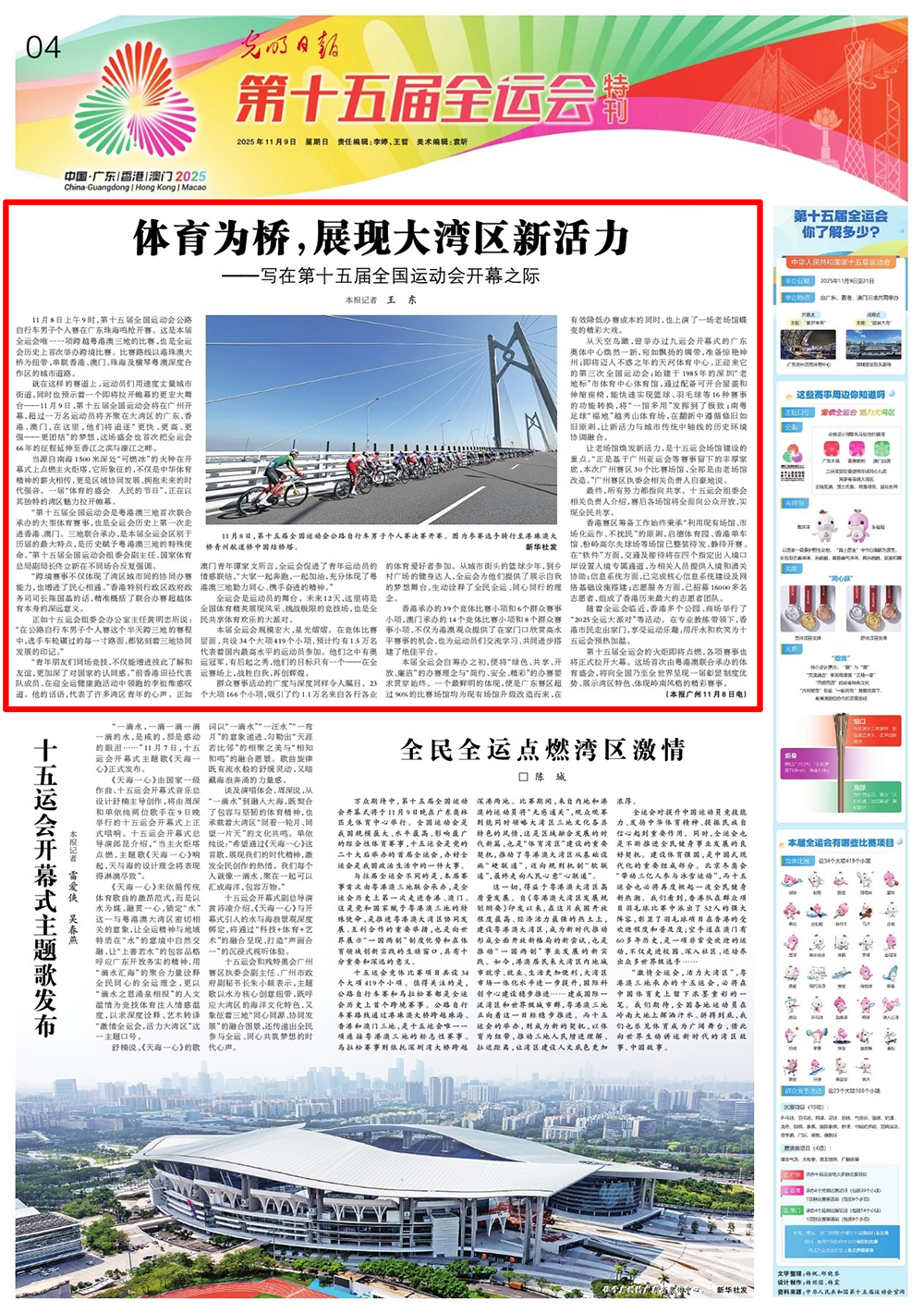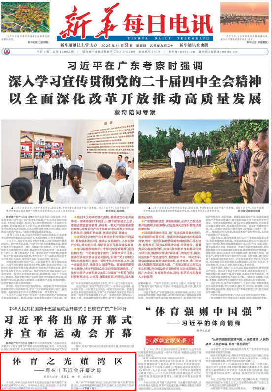 11月9日,由广东、香港、澳门联合承办的第十五届全国运动会隆重开幕。这是在“十四五”主要目标任务即将胜利完成、全国上下学习宣传贯彻党的二十届四中全会精神之际举办的一届体育盛会,必将推动我国体育事业发展再上新台阶,为亿万人民奋力开创中国式现代化建设新局面注入正能量。