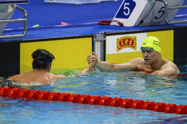 两代自由泳领军人物的手在泳池边紧紧一握,隔道相望。34岁的孙杨与21岁的潘展乐,两人年龄相差整整一轮,却在这片泳池中书写着中国游泳的传承故事。