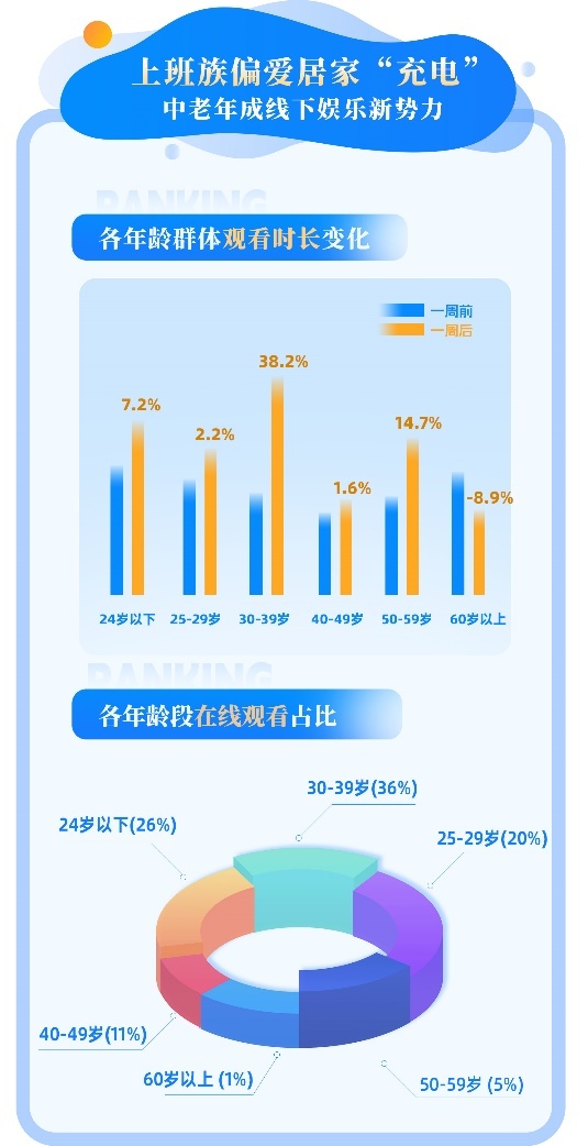 值得注意的是,30-39岁群体渐成“宅娱乐”主力。数据显示,这一群体的假期观看时长环比增长最为显著。较节前一周增长38.2%,而中老年群体则表现出更强的线下文化消费意愿。优酷工作人员认为这一现象反映出不同年龄段人群差异化的休假需求。“30到39岁的职场人士或因日常工作强度较高,更倾向于利用假期‘充电’,通过线上娱乐实现高效率的休闲放松。与此同时,拥有更多自主时间的中老年群体,则更愿意通过线下活动来丰富生活体验。”