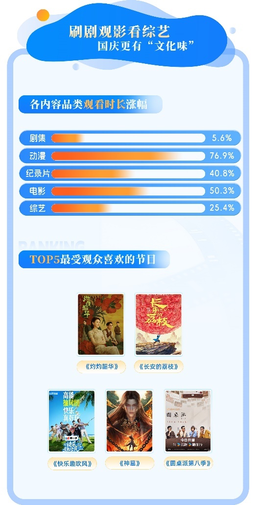 此外,《灼灼韶华》《绝命法官》等剧集、《快乐趣吹风》《百厨大战》等综艺,以及动漫《神墓》《云深不知梦》等多类型作品同样受到观众喜爱。优酷工作人员表示,国庆期间,除了传统的追剧观影刷综艺,更多观众倾向于有深度、有思想的文化类节目,也热衷体育赛事等新兴热点,这种多元化需求推动了线上内容的百花齐放。