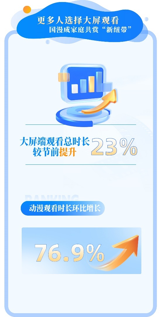 假期的线上文娱消费则呈现大屏化、沉浸式趋势。报告显示,国庆期间优酷观看时长增长主要来自大屏端,环比节前一周上涨23%。动漫、电影、综艺、纪录片四大品类涨幅最大,动漫类节目以76%的涨幅位居榜首。优酷工作人员分析称,以新国风为代表的国漫内容正在重塑客厅文化,成为连接两代人的娱乐新纽带。