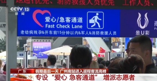除了加开验证通道和安检通道之外,广州南站还专设了“爱心/急客通道”,为老幼病残孕等特殊旅客及临近发车旅客提供优先服务;并在服务台、爱心候车区、母婴室等区域增派了70名青年志愿者,为旅客及时排忧解难。