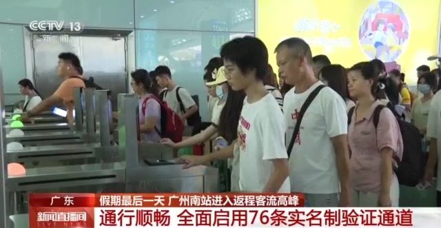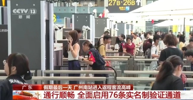 总台记者 秦芊茗:从10月6日开始,广州南站就进入了假期返程的客流高峰,今天许多旅客带着大包小包的行李来到候车大厅。为了让旅客安检更加通畅,在客流高峰期间,广州南站全面启用76条实名制验证通道与48条安检通道。虽然安检口的客流不少,但整体通行还是较为顺畅的,平均等候10分钟左右就能进入候车大厅。