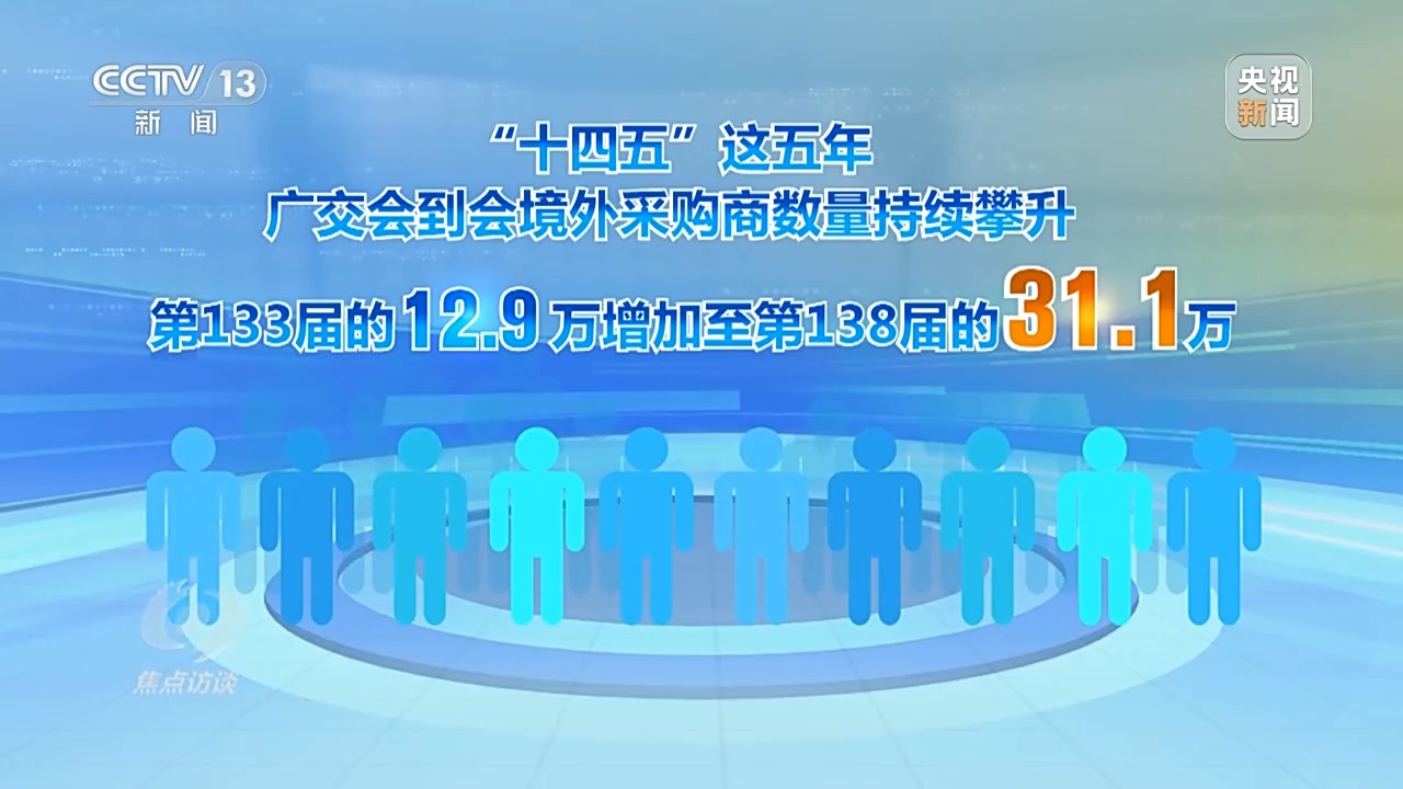 “十四五”这五年,广交会到会境外采购商数量持续攀升,从133届的12.9万增加至第138届的31.1万。结构也更加优化,发达经济体普遍增长,共建“一带一路”国家表现亮眼。头部采购商量质齐升,数量从102家增加到406家。