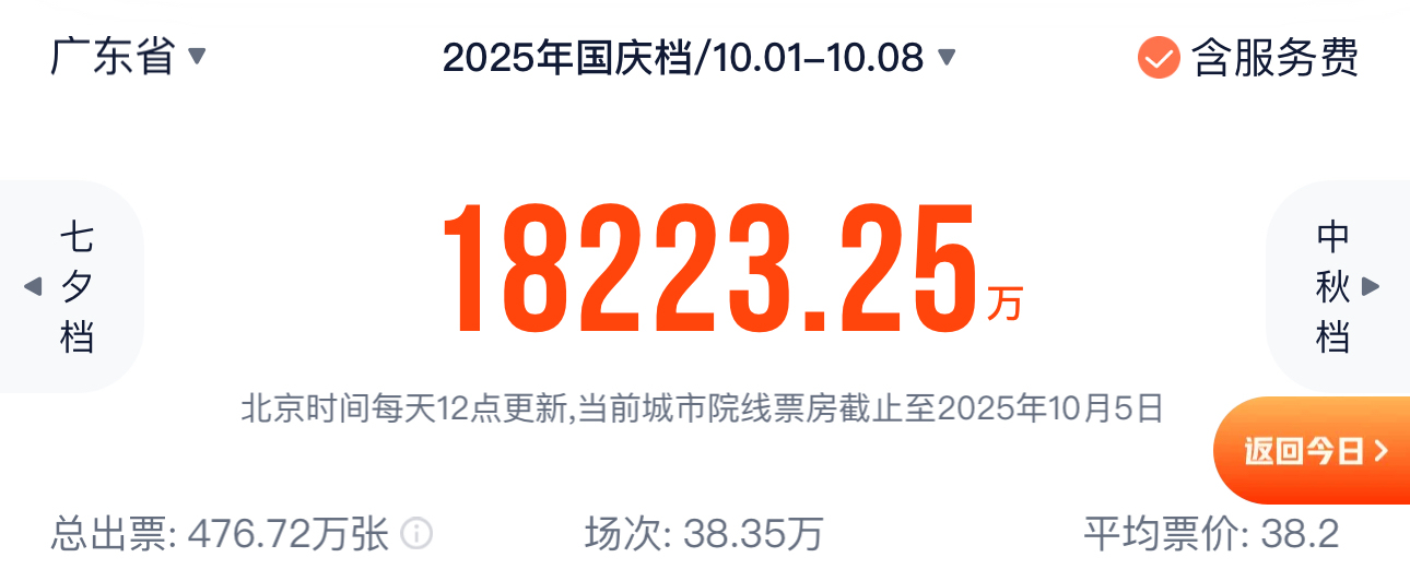 广东省以超1.82亿元的档期票房成绩领跑,约占全国票房的12.1%,总观影人次超476万,总放映场次达38.35万,继续稳居全国首位。