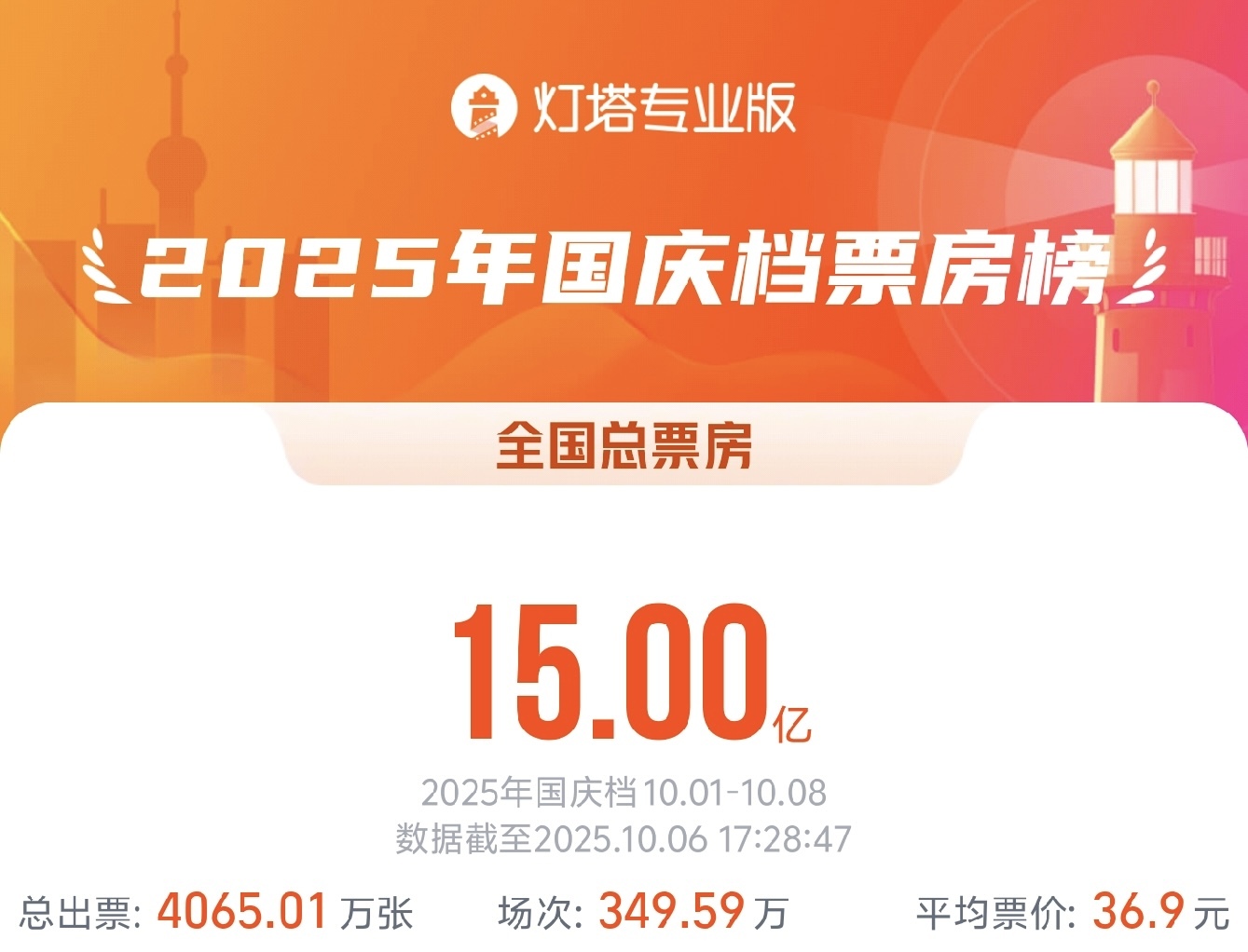 据网络平台数据,截至10月6日17时28分,2025年国庆档(10月1日—8日)总票房(含预售)突破15亿元,总观影人次超4065万,总放映场次超349万。