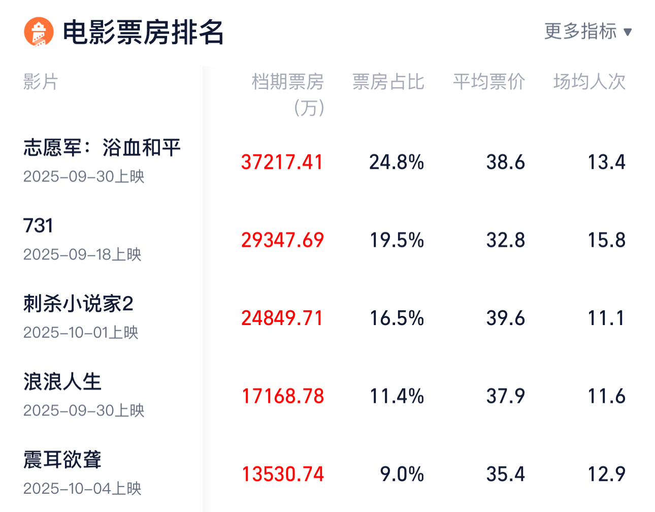 影片方面,《志愿军:浴血和平》《731》《刺杀小说家2》《浪浪人生》《震耳欲聋》暂列国庆档票房榜前五名 ,且各片档期票房均突破1亿元。