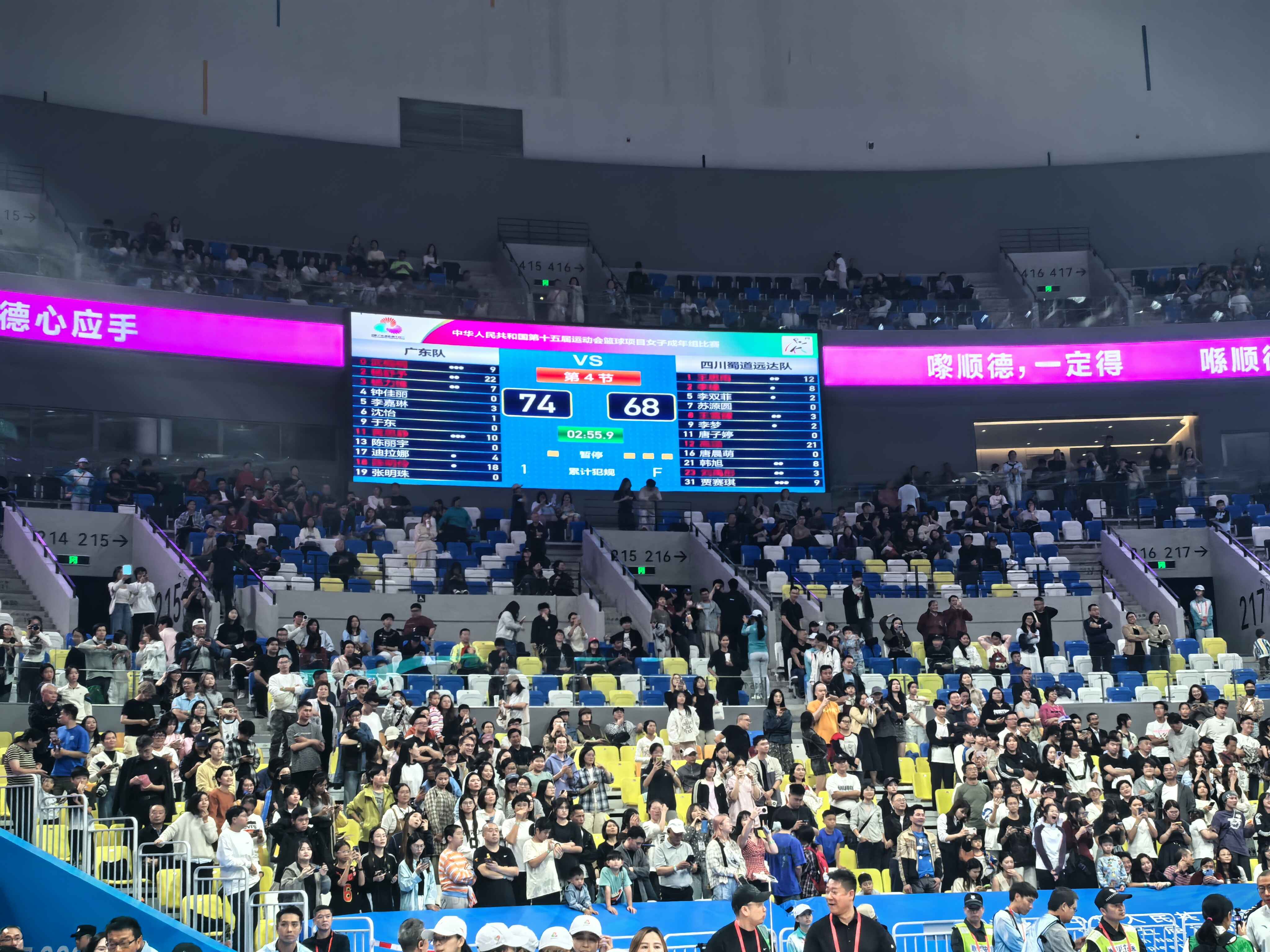 11月15日晚,十五运会女篮成年组决赛在佛山市顺德德胜体育中心打响,由东道主广东队对阵四川队。最终,广东队以74比68战胜四川队,夺得金牌。