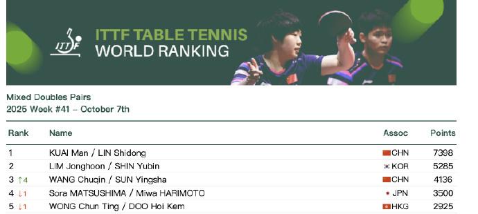 10月3日,WTT中国大满贯混双决赛,王楚钦/孙颖莎战胜队友黄友政/陈熠,获得WTT中国大满贯混双冠军。