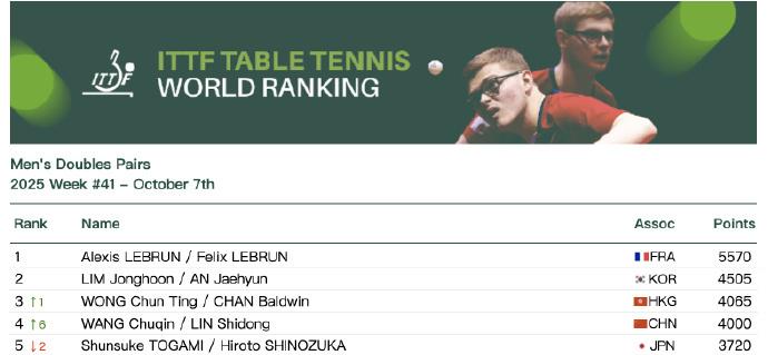 10月4日,WTT中国大满贯男双决赛上演“中国德比”,王楚钦/林诗栋3-0战胜周启豪/陈俊菘,夺得冠军。中国队包揽男双冠亚军。这也是王楚钦中国大满贯第二冠。
