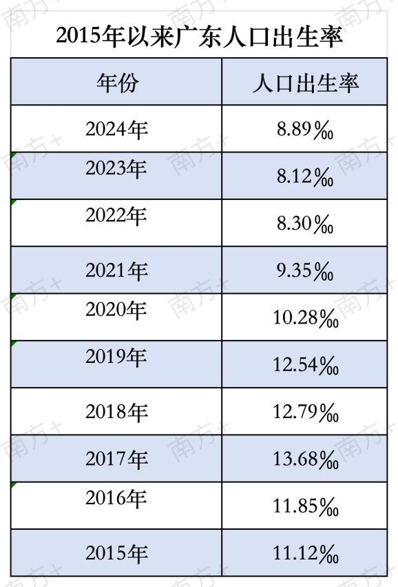 2016年,我国实施“全面两孩”政策,2017年广东人口出生率上升到13.68‰。此后几年出生率回落,直到2024年出生率为8.89‰,相比2023年增加0.77‰,这是自2017年以来首次出现同比回升。