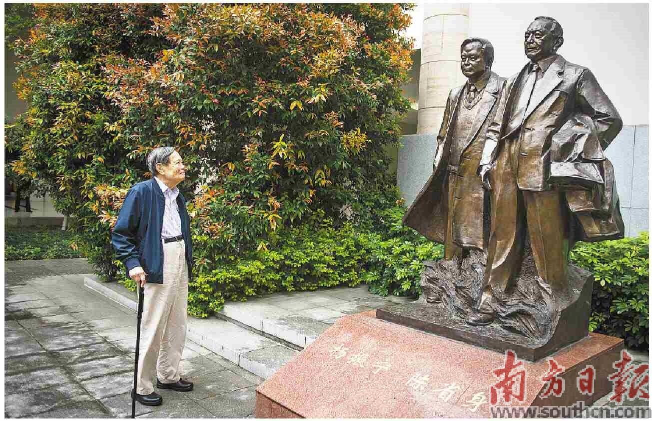 2017年4月,杨振宁参加东莞理工学院建校25周年活动。图为杨振宁观看校园内自己和陈省身铜像。南方日报记者 张梓望 摄