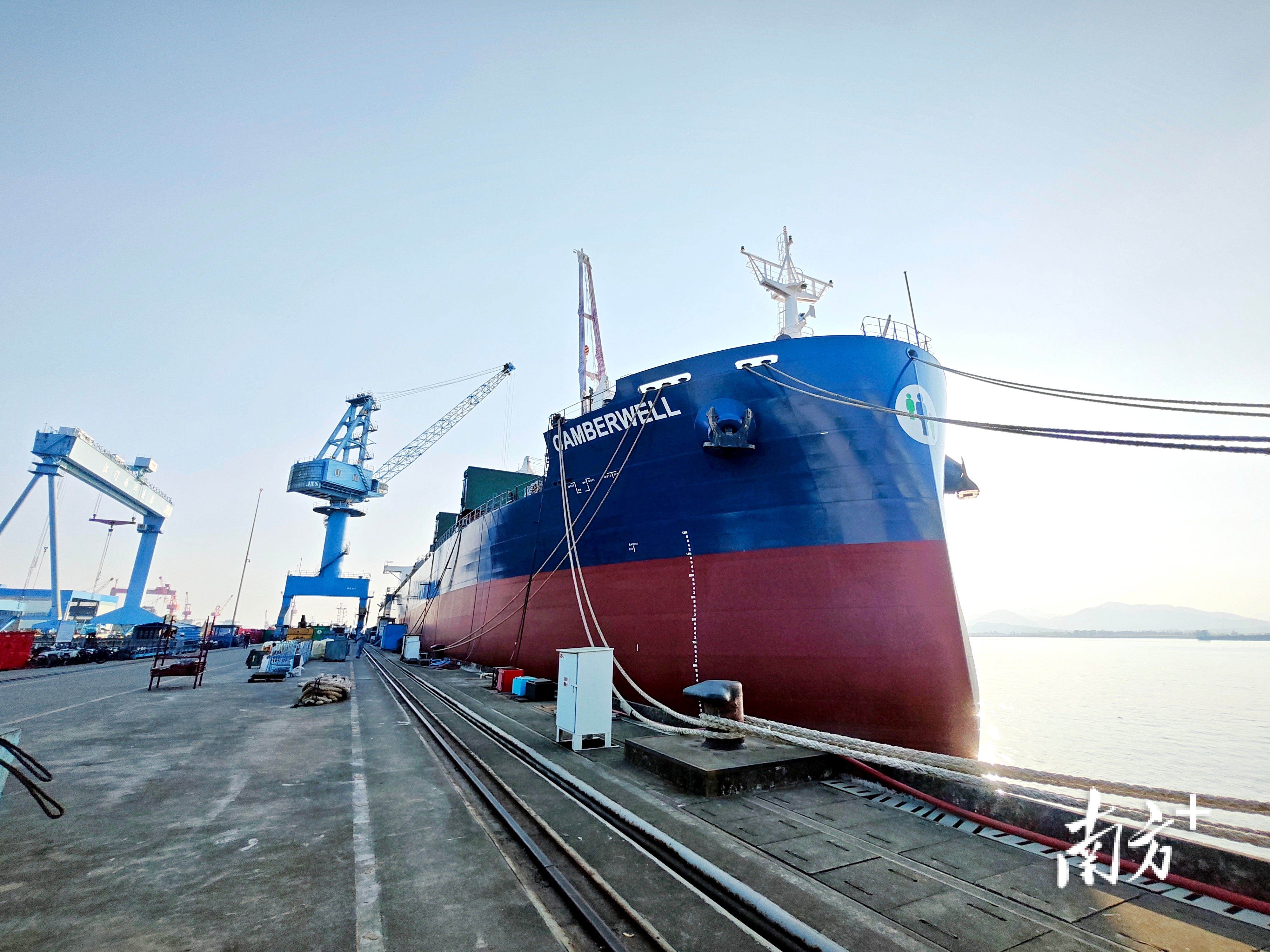走进成立最早的南洋船舶,一艘蓝红色敞口型节能环保散货船迎着朝阳平稳出坞,船身缓缓划破水面。