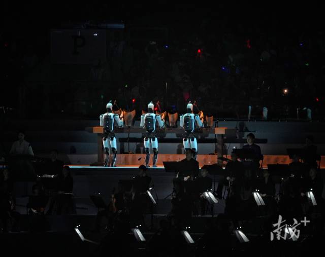 三个机器人整齐划一地敲响铜句鑃仿制品,现代科技让两千年前的声音回响在广东奥体中心体育场。