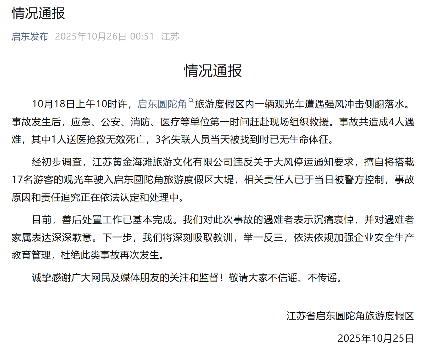 10月18日上午10时许,启东圆陀角旅游度假区内一辆观光车遭遇强风冲击侧翻落水。事故发生后,应急、公安、消防、医疗等单位第一时间赶赴现场组织救援。事故共造成4人遇难,其中1人送医抢救无效死亡,3名失联人员当天被找到时已无生命体征。