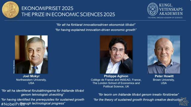 北京时间10月13日17时45分,2025年诺贝尔经济学奖揭晓,经济学家乔尔·莫基尔(Joel Mokyr)、菲利普·阿吉翁(Philippe Aghion)和彼得·豪伊特(Peter Howitt)获奖,他们共同解释了创新驱动的经济发展的相关现象。