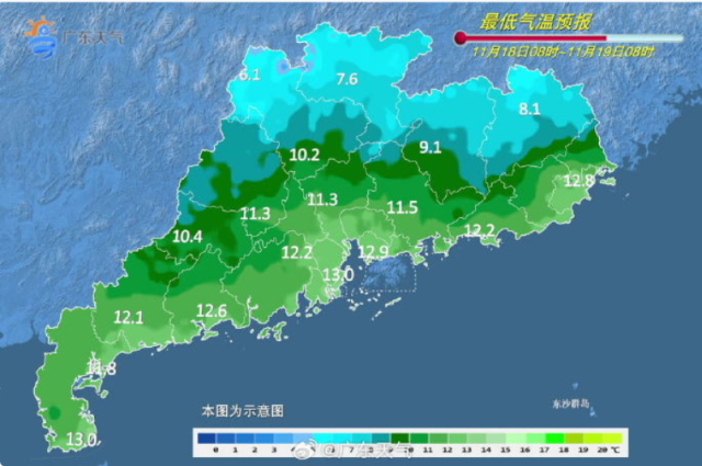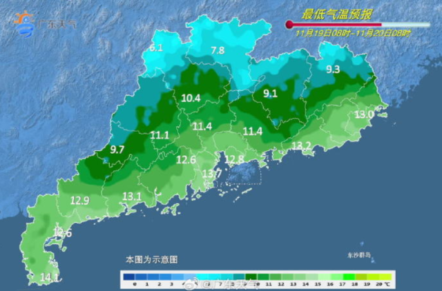 另外,此次降温过程中大部分市县的最低温将出现在20日早晨前后,届时粤北偏北市县最低温或将低至5℃-8℃(粤北高海拔山区2℃-5℃)。