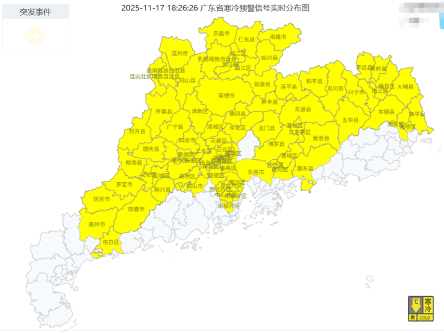 鉴于强冷空气影响,粤北多地发布今年下半年来首个寒冷预警。截至17日17时,乐昌、英德、从化等多个市县已发布寒冷黄色预警。