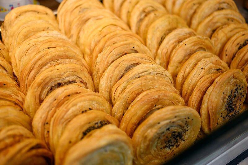蝴蝶酥最大的特点就在于“酥”,为了做出蝴蝶酥层层酥皮的效果,师傅需要将裹住黄油的面皮擀开、折叠,再擀开、再折叠,其间还要不停撒糖,一遍又一遍。这是件极讲究功夫的活儿,面皮不能破,黄油不能漏,每一层都要平滑均匀。有的蝴蝶酥,甚至足足有256层酥皮。