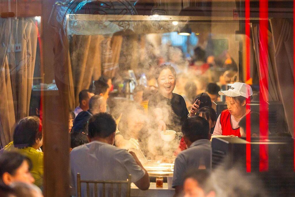 翻滚的红油锅底冒着泡泡,毛肚在锅里“七上八下”后裹满蒜泥香油,鸭肠嚼起来脆嫩弹牙……无论是毛肚、黄喉、鸭血、鹅肠、酥肉、脑花、肥牛,还是海鲜、蔬菜,只要丢进锅里,都能染上锅底的醇厚香气,满足不同人的口味。百姓的悲欢离合,也都在这氤氲的热气里徐徐展开。