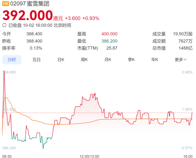 市场方面,蜜雪集团2日港股收报392港元/股,上涨0.93%,最新市值1488亿港元。