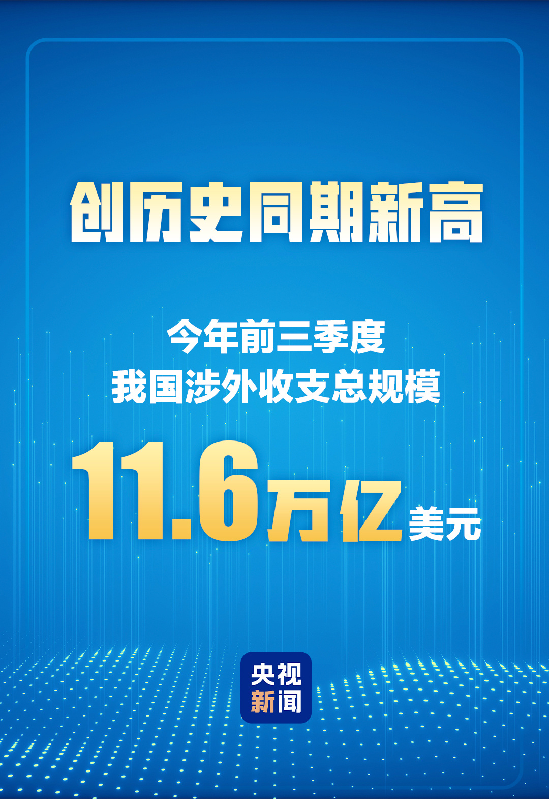 国家外汇管理局10月22日发布数据显示,今年前三季度,我国涉外收支总规模11.6万亿美元,创历史同期新高,同比增长10.5%,跨境资金净流入1197亿美元,银行结售汇顺差632亿美元,均高于上年同期水平。