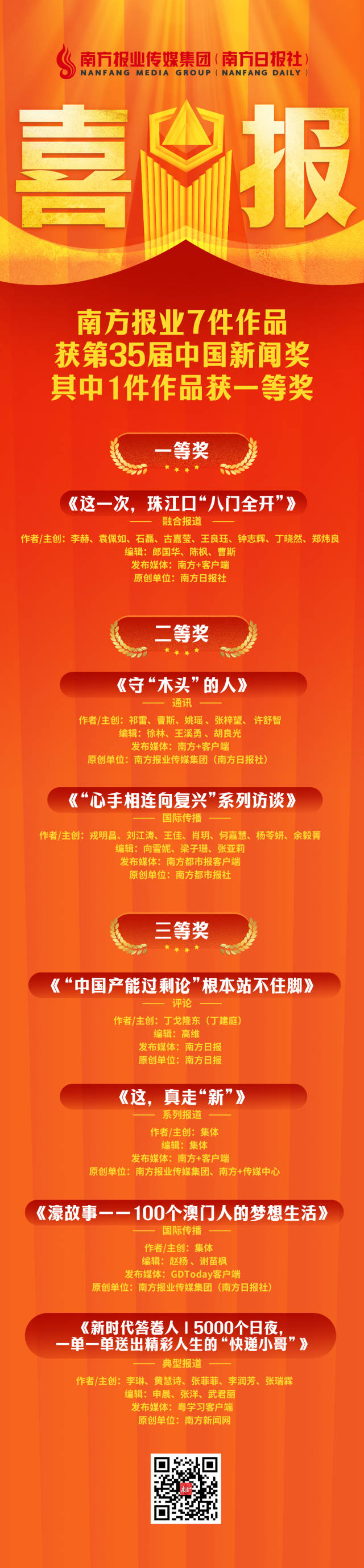 11月5日,由中华全国新闻工作者协会主办的第35届中国新闻奖评选结果揭晓。南方报业传媒集团共有7件作品获奖,其中一等奖1件、二等奖2件、三等奖4件,获奖数量创集团历年新高,占广东媒体获奖数量近半,在全国省级媒体中位居前列。