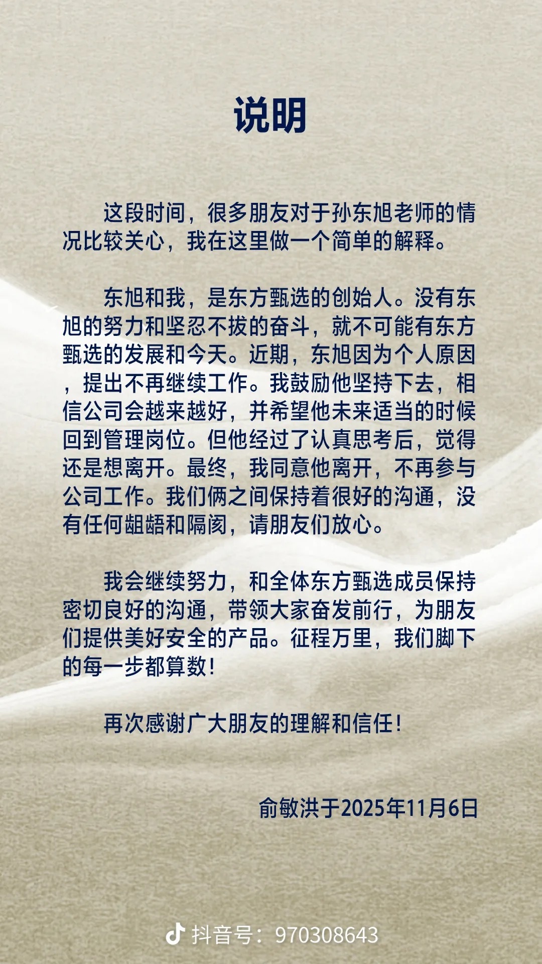 11月6日,俞敏洪发布说明称,确认孙东旭离职。说明中提到,“东旭和我,是东方甄选的创始人。没有东旭的努力和坚忍不拔的奋斗,就不可能有东方甄选的发展和今天。近期,东旭因为个人原因,提出不再继续工作。我鼓励他坚持下去,相信公司会越来越好,并希望他未来适当的时候回到管理岗位。但他经过了认真思考后,觉得还是想离开。最终,我同意他离开,不再参与公司工作。我们俩之间保持着很好的沟通,没有任何龃龉和隔阂,请朋友们放心。”