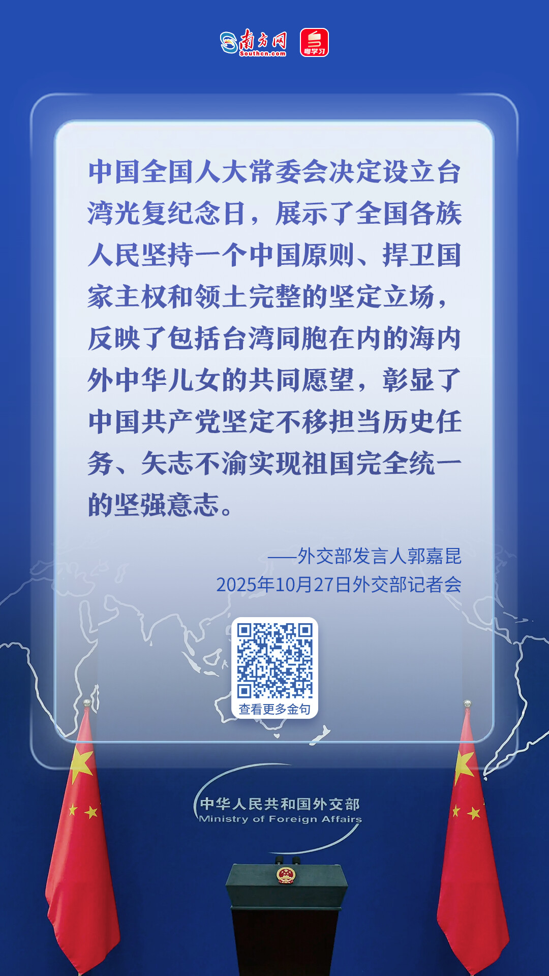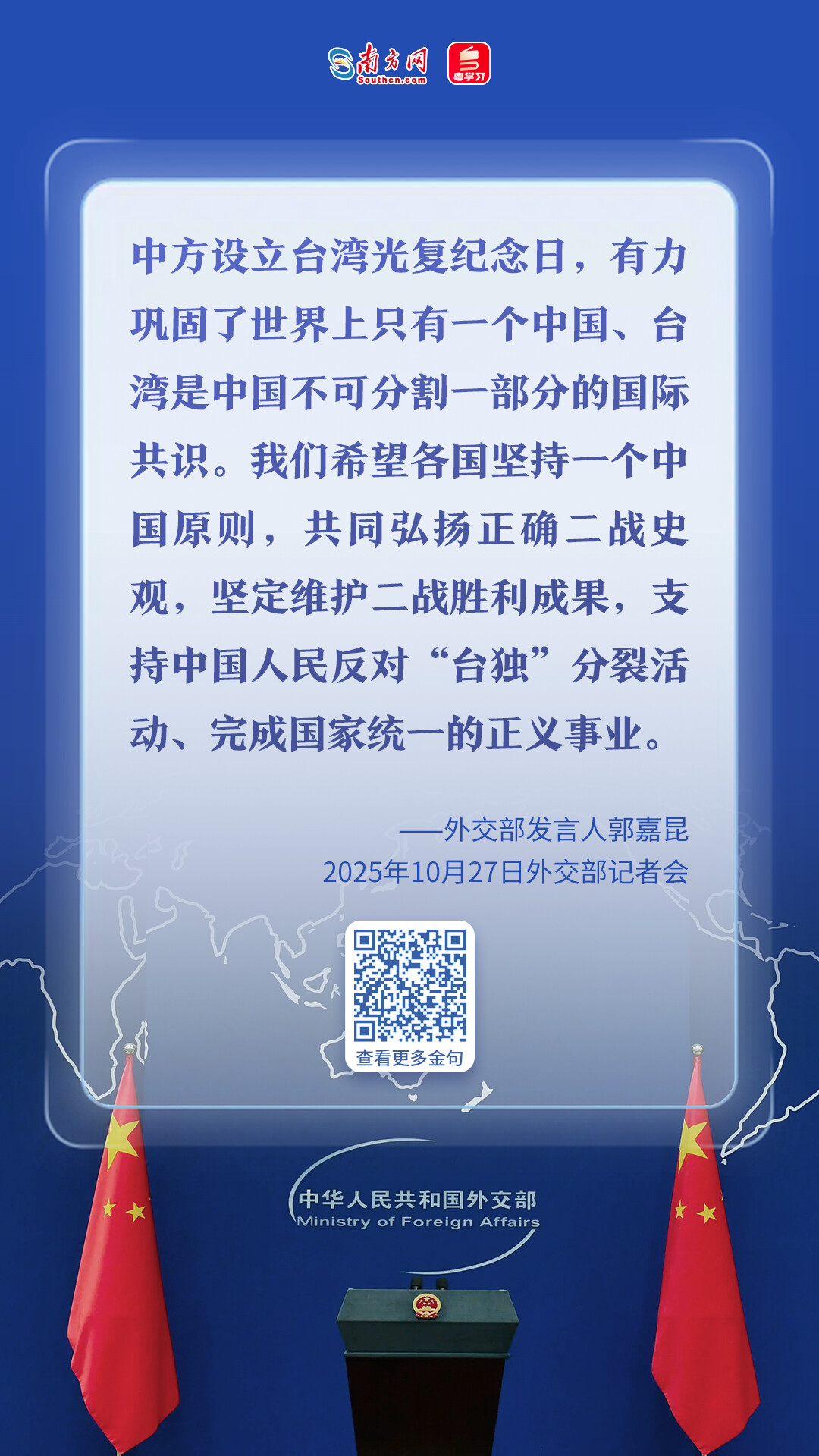 10月27日,外交部发言人郭嘉昆主持例行记者会,就中方设立台湾光复纪念日、中美经贸磋商、美军机在南海坠毁等问题回答记者提问(查看实录>>>)。一组图片带你速览今日外交部记者会要点。