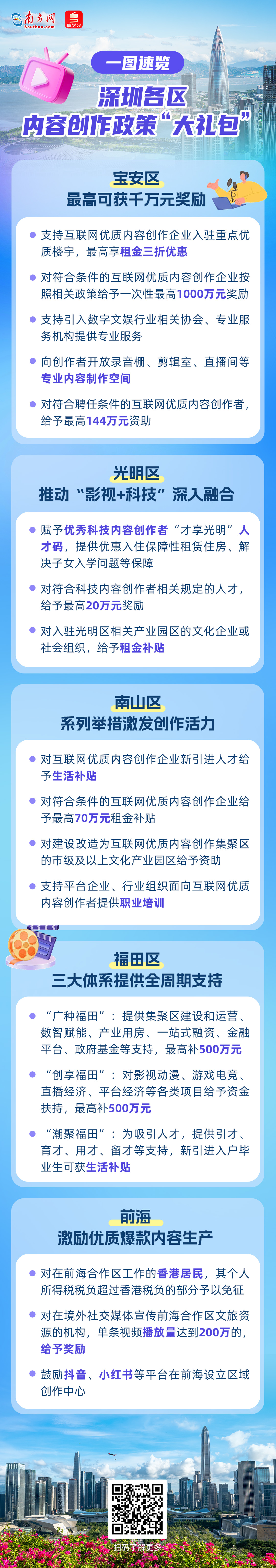 10月28日,2025内容创作者嘉年华在广州启动,集中发布了广东首个内容创作者发展扶持政策包。其中,深圳市宝安、光明、南山、福田等4区以及前海发布了一大批优质内容创作扶持政策,既有资金支持,又有生活补贴,还有免费开放的内容制作空间,力度大、很贴心!@全球创作者,快来领取吧↓↓