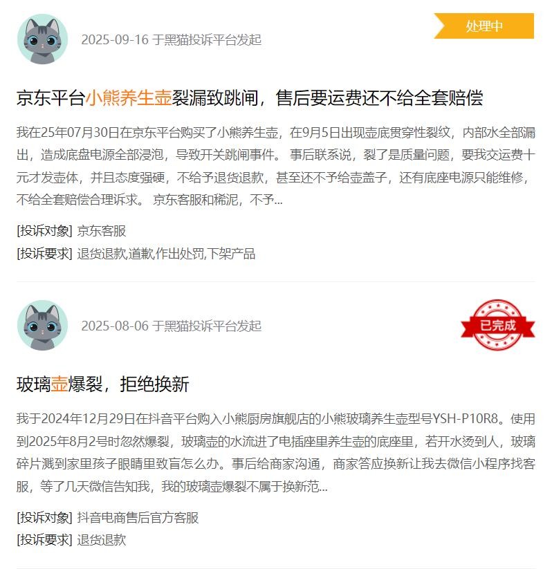 例如2025年8月6日有消费者投诉,称其于2024年12月29日购买的小熊玻璃养生壶于2025年8月2日时突然爆裂,玻璃壶的水流进了电插座里,消费者称:“若开水烫到人,玻璃碎片溅到家里孩子眼睛里致盲怎么办。”事后该消费者与商家沟通,商家表示事件中的玻璃壶爆裂不属于换新范围,让其购买一个配件并报销。对此,消费者无法认同并表示,玻璃壶用7个月就爆裂已经有心里阴影。