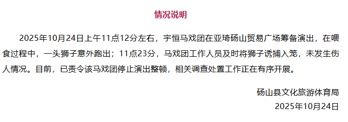10月24日,安徽宿州砀山县文化旅游体育局发布情况称,当天上午11点12分左右,宇恒马戏团在亚琦砀山贸易广场筹备演出,在喂食过程中,一头狮子意外跑出。11点23分,马戏团工作人员及时将狮子诱捕入笼,未发生伤人情况。目前,已责令该马戏团停止演出整顿,相关调查处置工作正在有序开展。