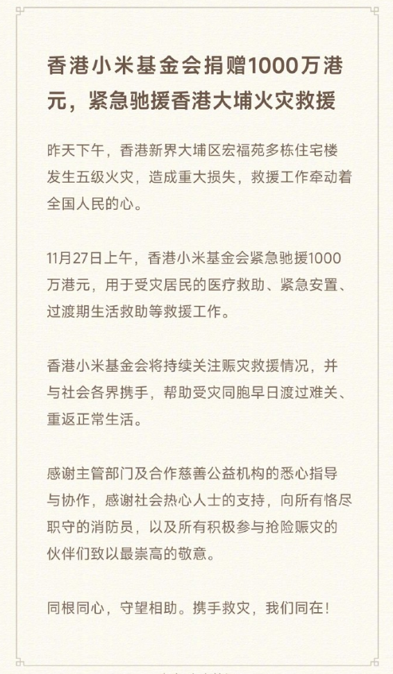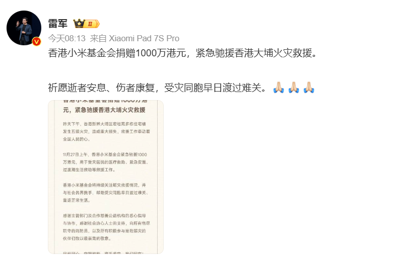 11月27日早,@雷军 发文称,香港小米基金会捐赠1000万港元,紧急驰援香港大埔火灾救援。祈愿逝者安息、伤者康复,受灾同胞早日渡过难关。