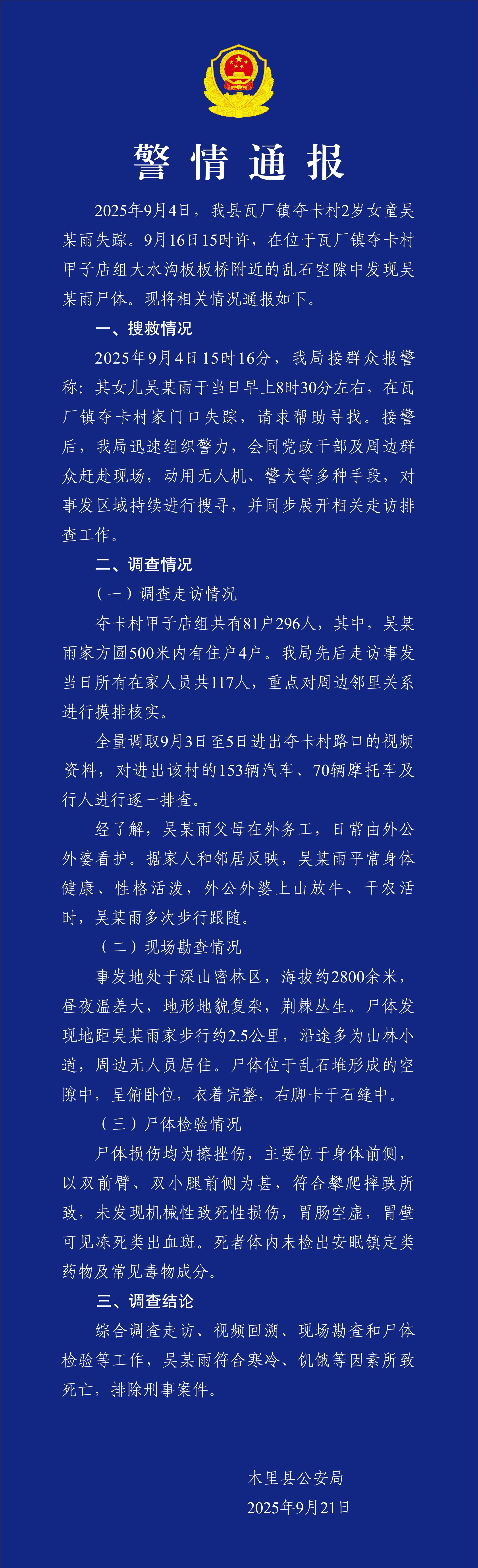 通报称,2025年9月4日,木里县瓦厂镇夺卡村2岁女童吴某雨失踪。9月16日15时许,在位于瓦厂镇夺卡村甲子店组大水沟板板桥附近的乱石空隙中发现吴某雨尸体。