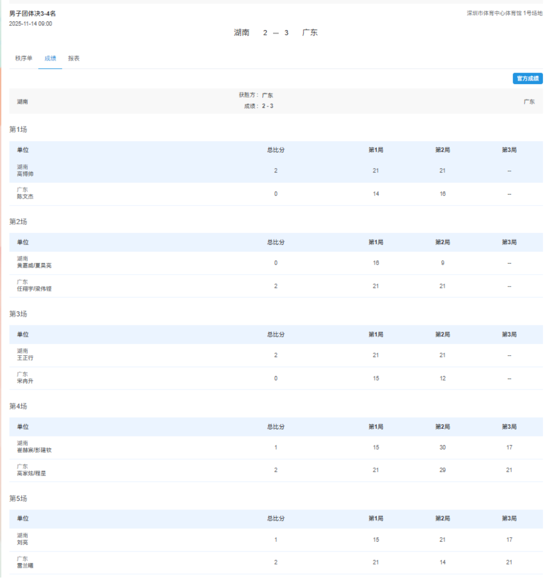11月14日,十五运会羽毛球项目男子团体铜牌赛由广东队对阵湖南队,在深圳市体育中心体育馆打响。经过约4小时44分的拉锯战,最终广东队以大比分3比2胜出,夺得该项赛事的铜牌。