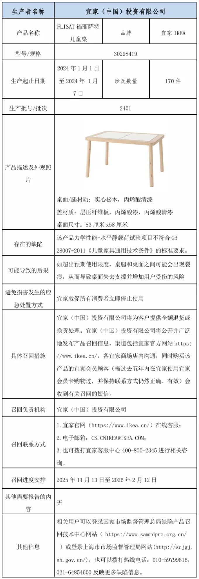 11月14日,据上海市场监管局通报,宜家(中国)投资有限公司自2025年11月13日至2026年2月12日召回2024年1月1日至2024年1月7日生产的宜家IKEA牌FLISAT福丽萨特儿童桌,共计170件。