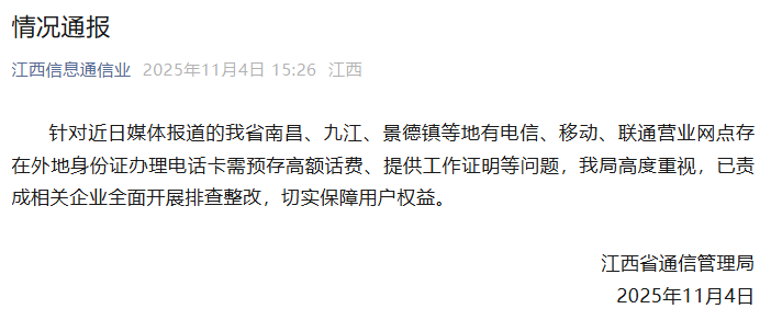 11月4日,江西省通信管理局发布情况通报称,针对近日媒体报道的南昌、九江、景德镇等地有电信、移动、联通营业网点存在外地身份证办理电话卡需预存高额话费、提供工作证明等问题,该局高度重视,已责成相关企业全面开展排查整改,切实保障用户权益。