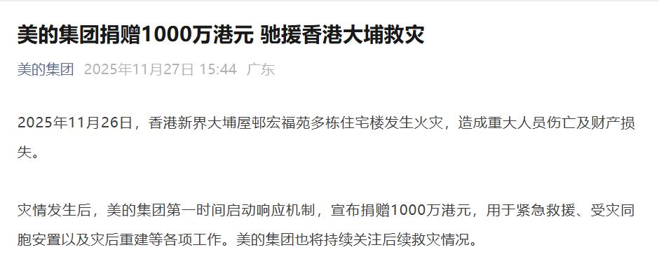 美的集团宣布捐赠 1000 万港元,驰援香港大埔救灾