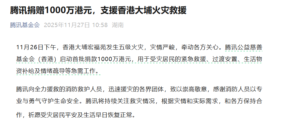 腾讯捐赠1000万港元,支援香港大埔火灾救援