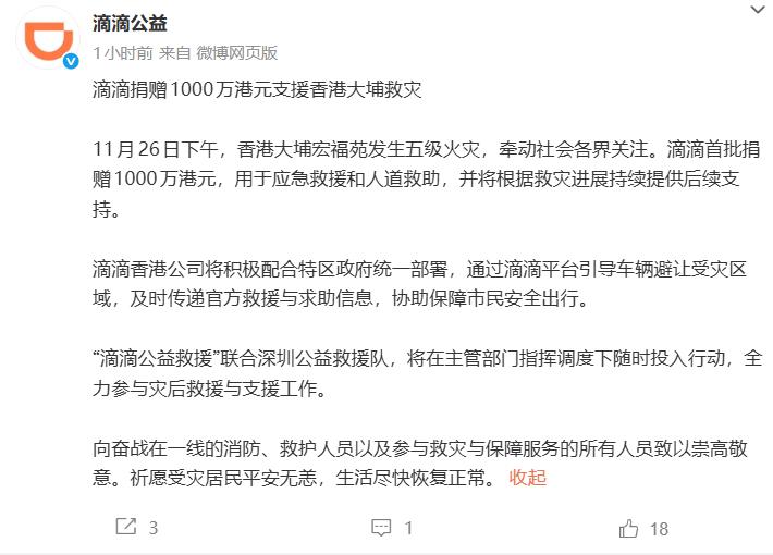 滴滴公益官微表示,滴滴首批捐赠 1000 万港元用于应急救援、人道救助,将根据救灾进展持续提供后续支持。同时,滴滴香港会配合部署,平台同步引导车辆避让受灾区域、传递官方救援与求助信息,协助保障市民出行。