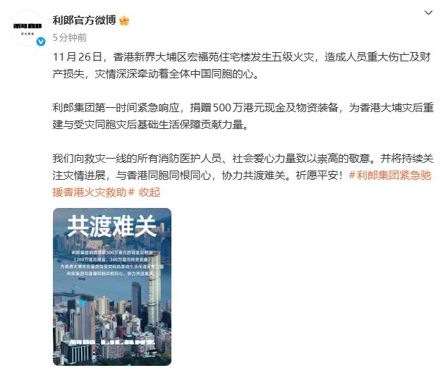 11月27日早,@雷军 发文称,香港小米基金会捐赠1000万港元,紧急驰援香港大埔火灾救援。祈愿逝者安息、伤者康复,受灾同胞早日渡过难关。