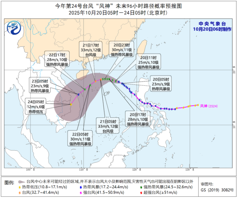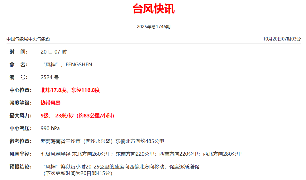 中央气象台10月20日6时继续发布台风蓝色预警。今年第24号台风“风神”(热带风暴级)的中心今天(20日)7时位于海南省三沙市(西沙永兴岛)东偏北方向约485公里的南海海面上,即北纬17.8度、东经116.8度,中心附近最大风力有9级(23米/秒),中心最低气压为990百帕,七级风圈半径220-280公里。