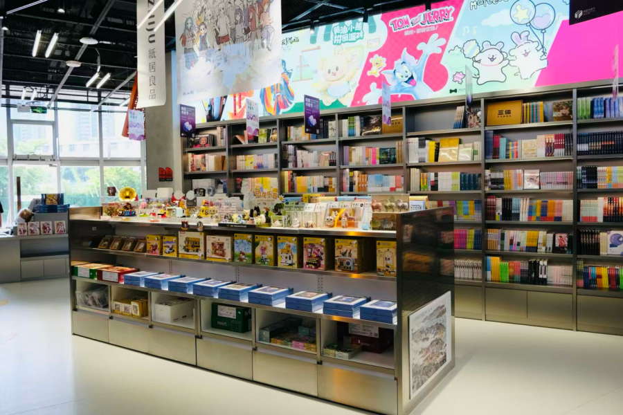 其中,位于首层的“潮玩IP”主题区,成为“吃谷”青年的狂欢主场。潮漫谷子书店内,IP文创、动漫徽章、各类限量手办琳琅满目,再现“人从众”的热闹景象。